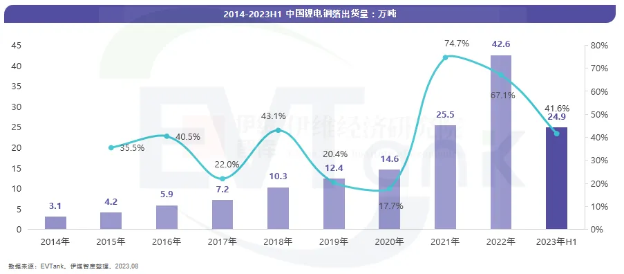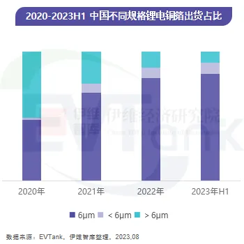 白皮书统计数据显示,2023年上半年,中国锂电铜箔总体出货量达到24.9万吨,同比增长41.6%,锂电铜箔出货量在整个电解铜箔中的比例进一步提升至55.8%。
