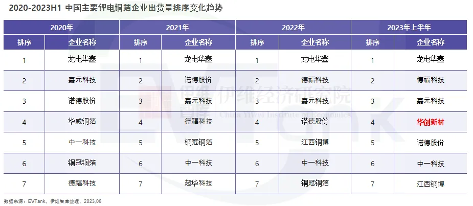 根据EVTank数据,锂电铜箔行业的竞争格局并不稳定,虽然龙电华鑫近几年一直为行业龙头,但是行业排名靠前的几家企业的排序基本每年均发生变化。2023年上半年,华创新材总体出货量超越铜冠铜箔、中一科技、江西铜博和诺德股份等企业,排名上升到行业第四位。